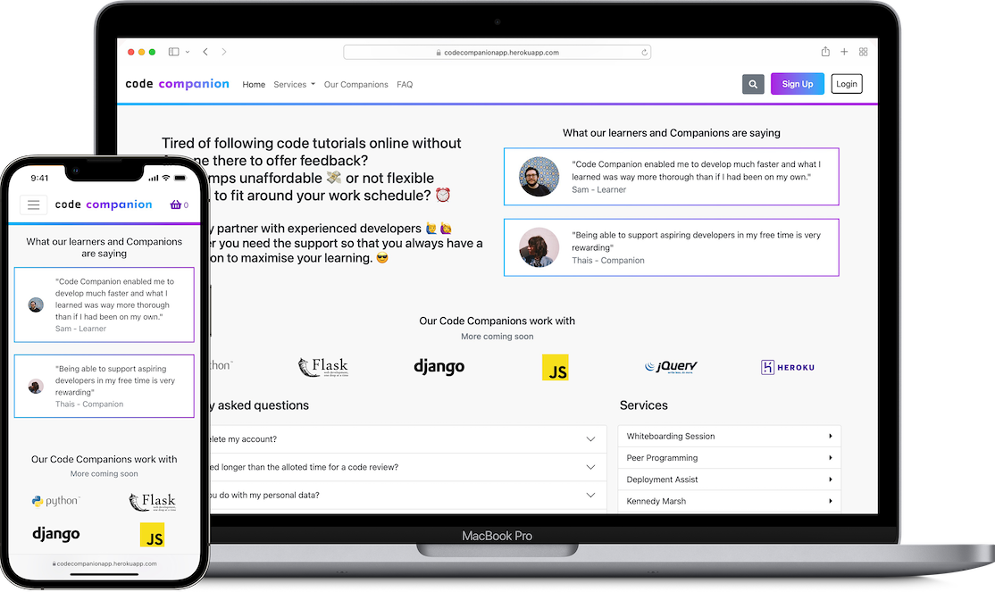 Code Companion allowed users to sign up as either students or Companions (teachers), and book sessions for support with their web development education. The booking process handled clashes in Companions schedules, and used Jitsi's API to embed a web conferencing platform that becomes available at the time of the session.